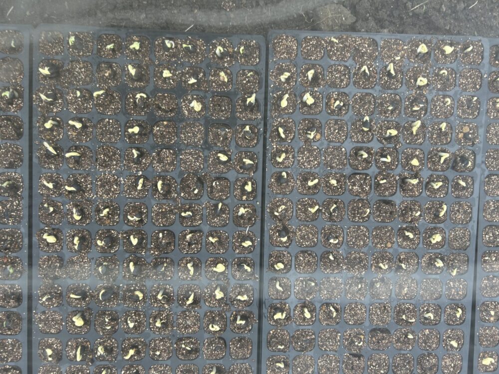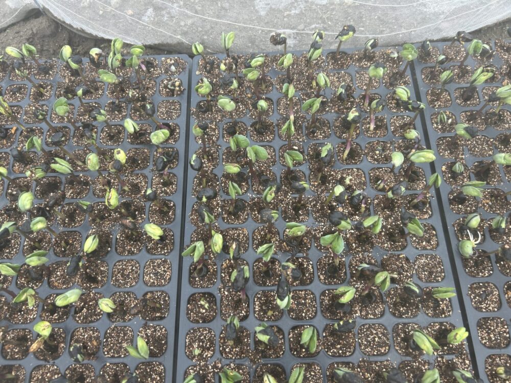 播種から1週間で、双葉がしっかりと開き始めました。適度な温度と湿度、毎日の水管理が功を奏し、セルトレイの中からまっすぐに伸びる芽が並ぶ様子は、まさに命の芽吹きです。