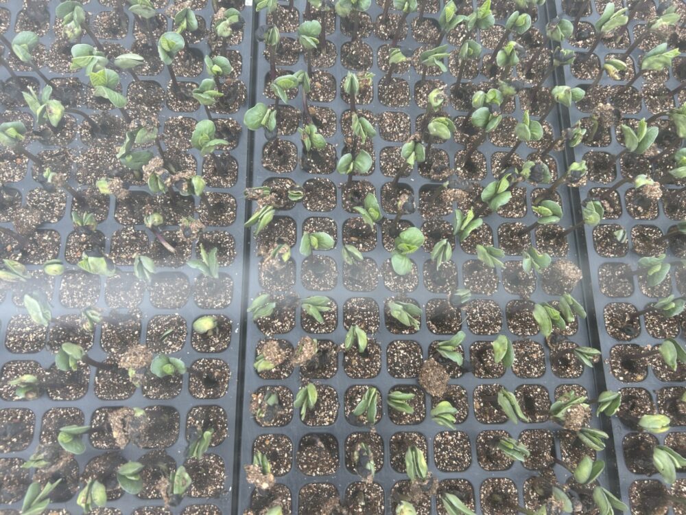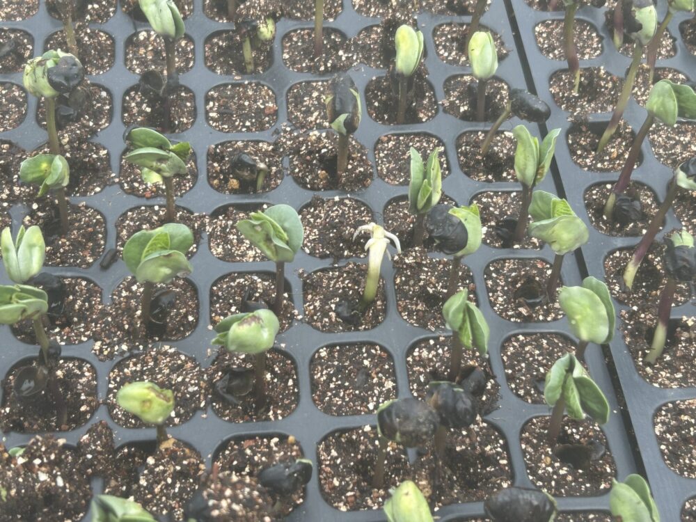なので、一粒ずつ丁寧に「へそ」を下向きに播種した苗は、まっすぐに伸びて、双葉も力強く開いています。土からしっかりと根を張り、葉も上を向いて光を求めて伸びています。