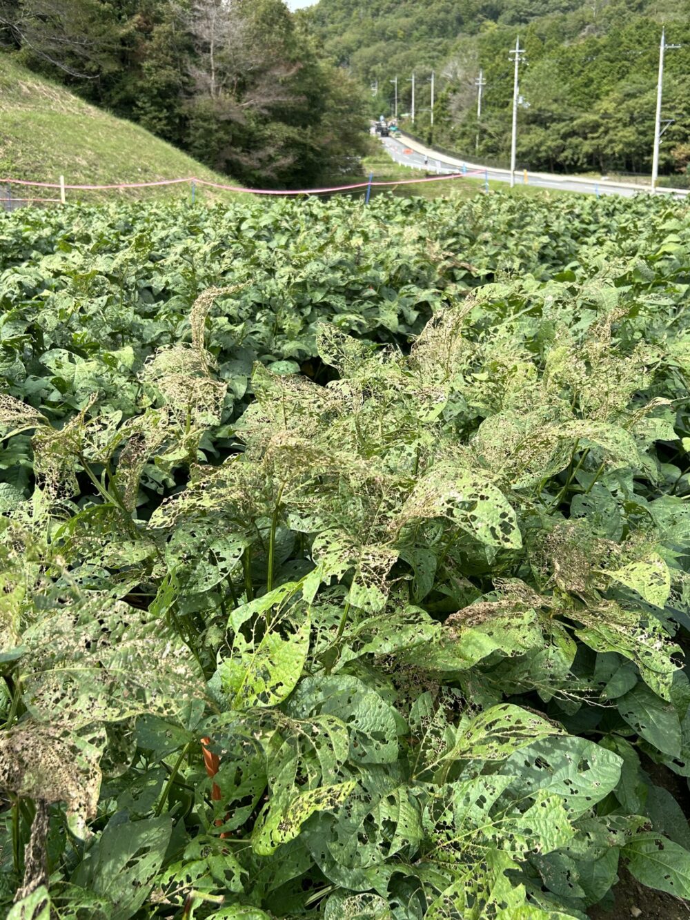 最初の異変に気付いたのは、定植から2日後。苗が数本、根元から引き抜かれているのを見つけました。「まさか」と思いながらもピンクテープを張り警戒を高めました。それでも翌日には数百本4日目にはすべてやられました。