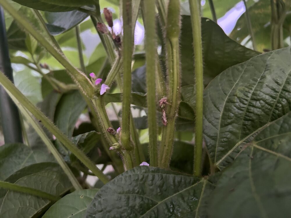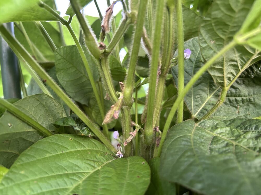 小さな紫色の花が株のあちらこちらに顔を出し、これから莢を付ける大切な時期の始まりです。