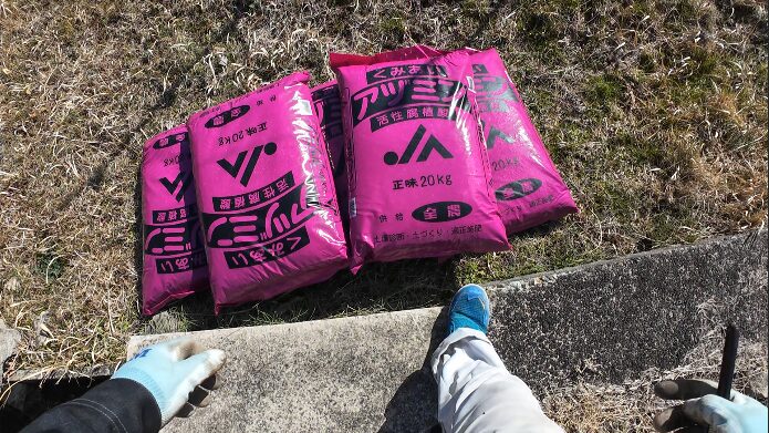 荒木農園ではその代わりとして、**アズミンを1反あたり40kg(20kg袋を2袋)**散布しています。