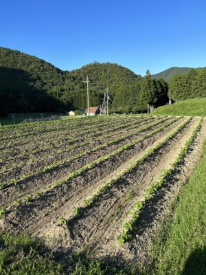 土寄せは、非常に重労働でまた気温も30℃を超える時期に行うため体力を使う大変しんどい作業ですが、黒大豆栽培には重要な作業でもあります。